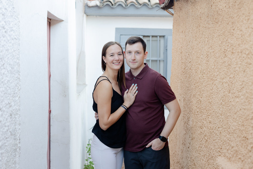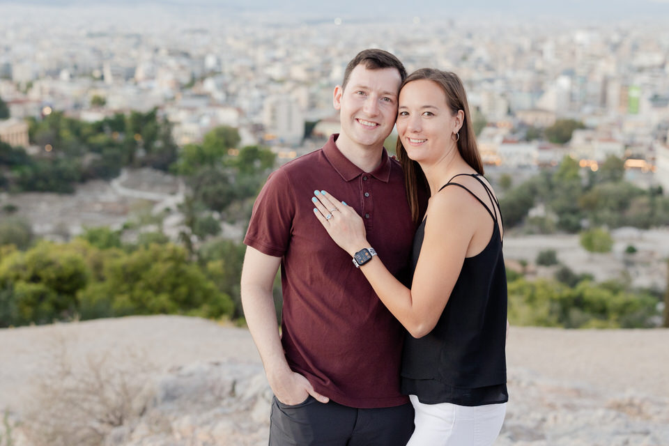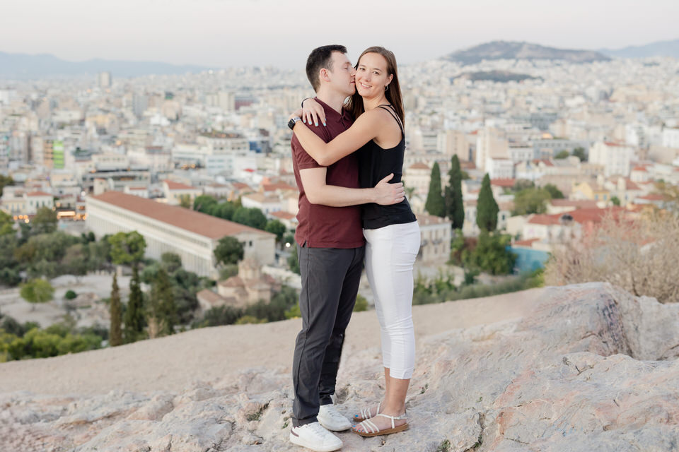 The marriage proposal in Anafiotika, greeted by the golden hues of the sunset, cast a warm glow over the white buildings.