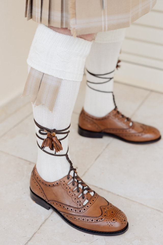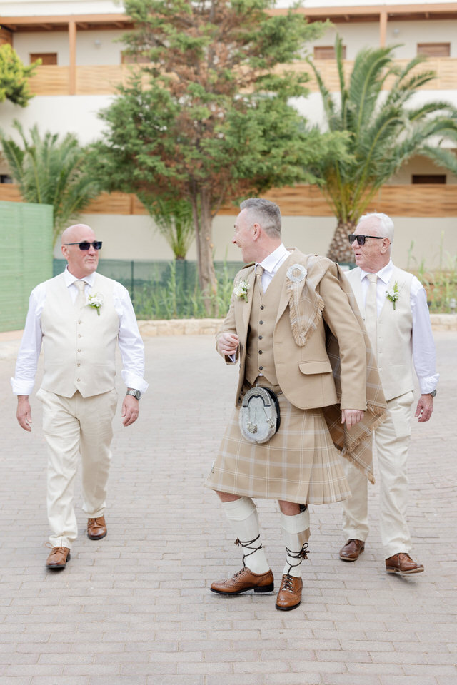He wore a gray classical Scottish Kilt and tartan suit, perfectly tailored for the warm Cretan weather.