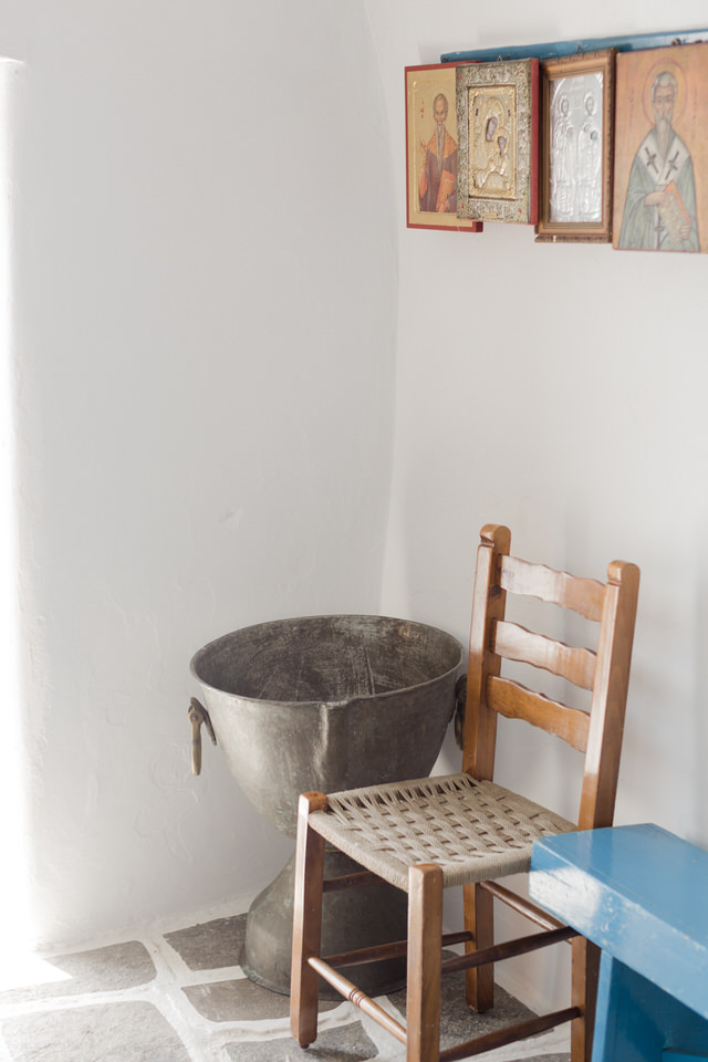 It is a small white stone building with an incredible view of the Aegean sea and Antimilos.
