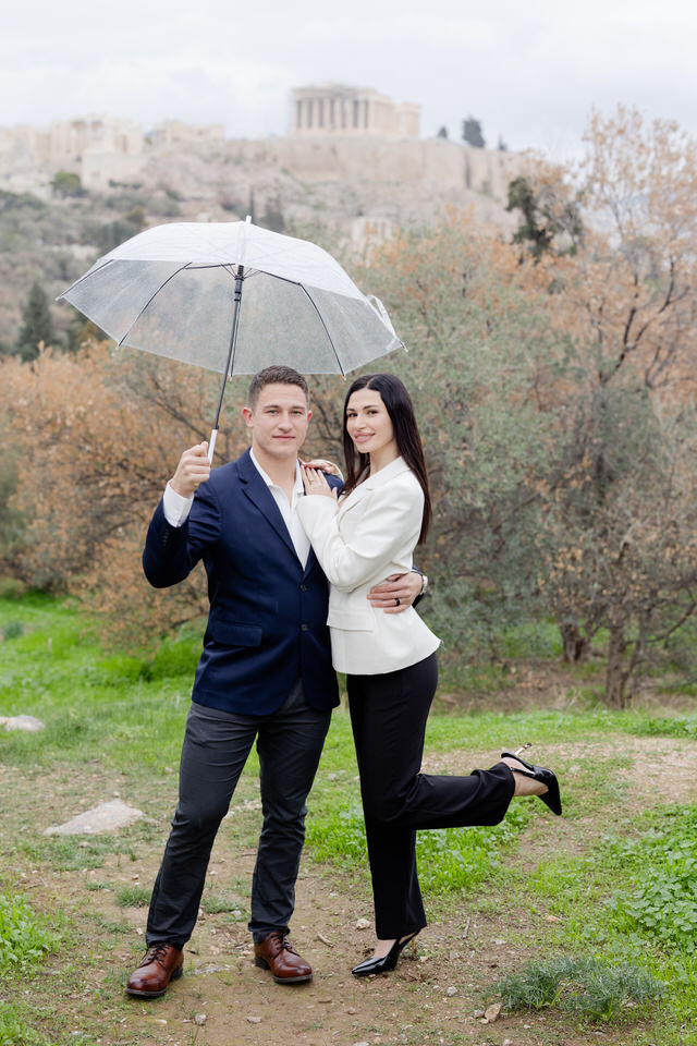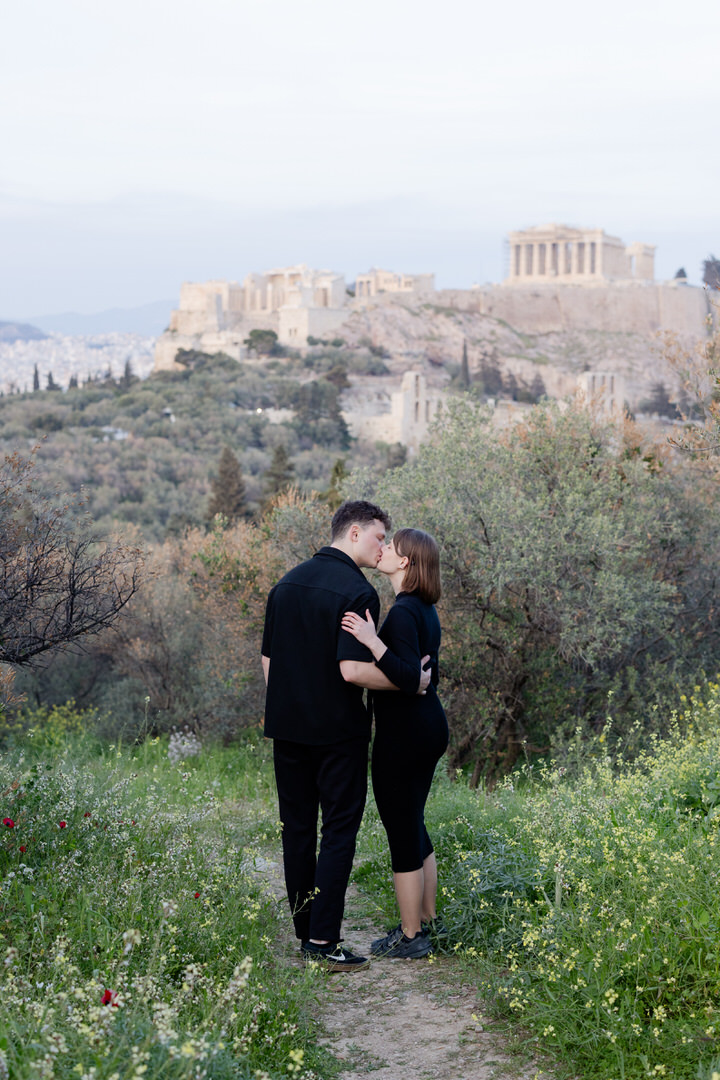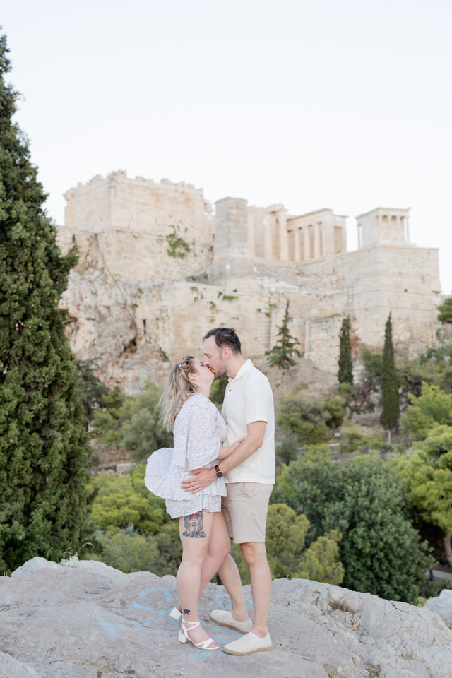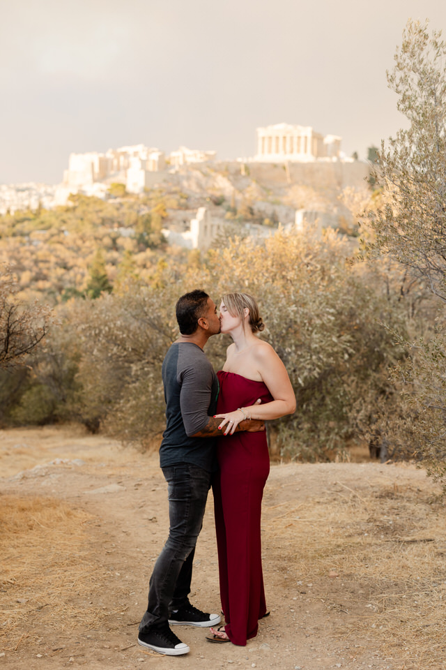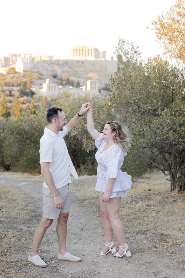 The most popular location is around the Acropolis. The top choice for many couples is Fillopappou Hill. It's easily accessible and less crowded, and we have the Acropolis as a background.