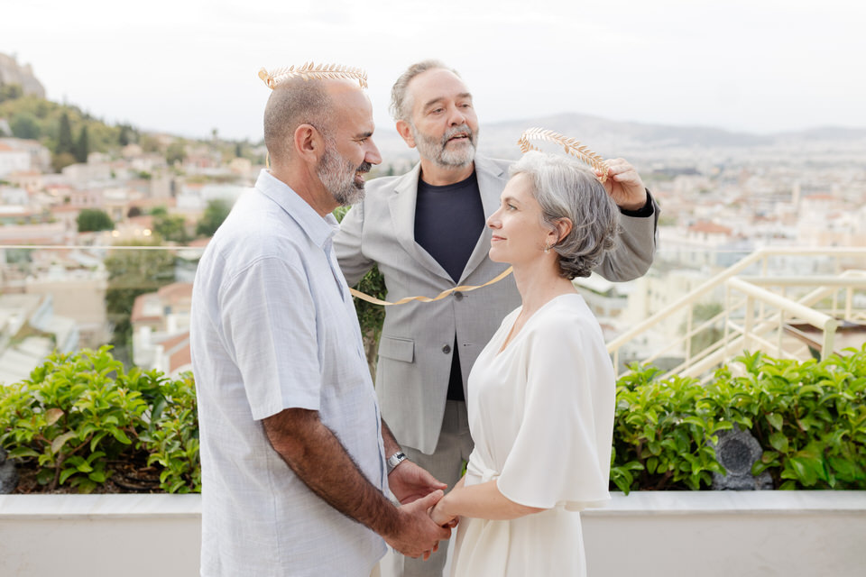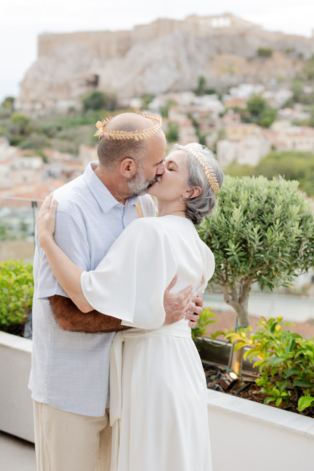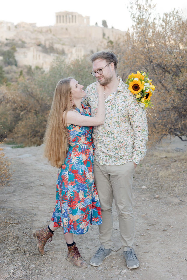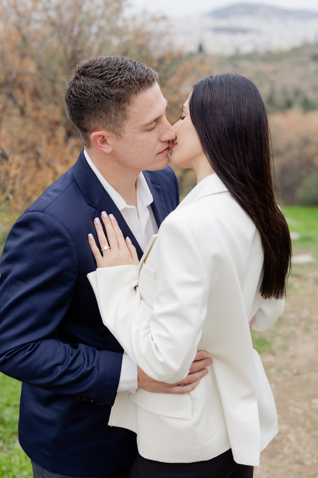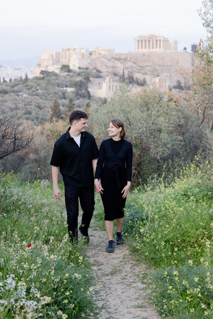 The most popular location is around the Acropolis. The top choice for many couples is Fillopappou Hill. It's easily accessible and less crowded, and we have the Acropolis as a background.